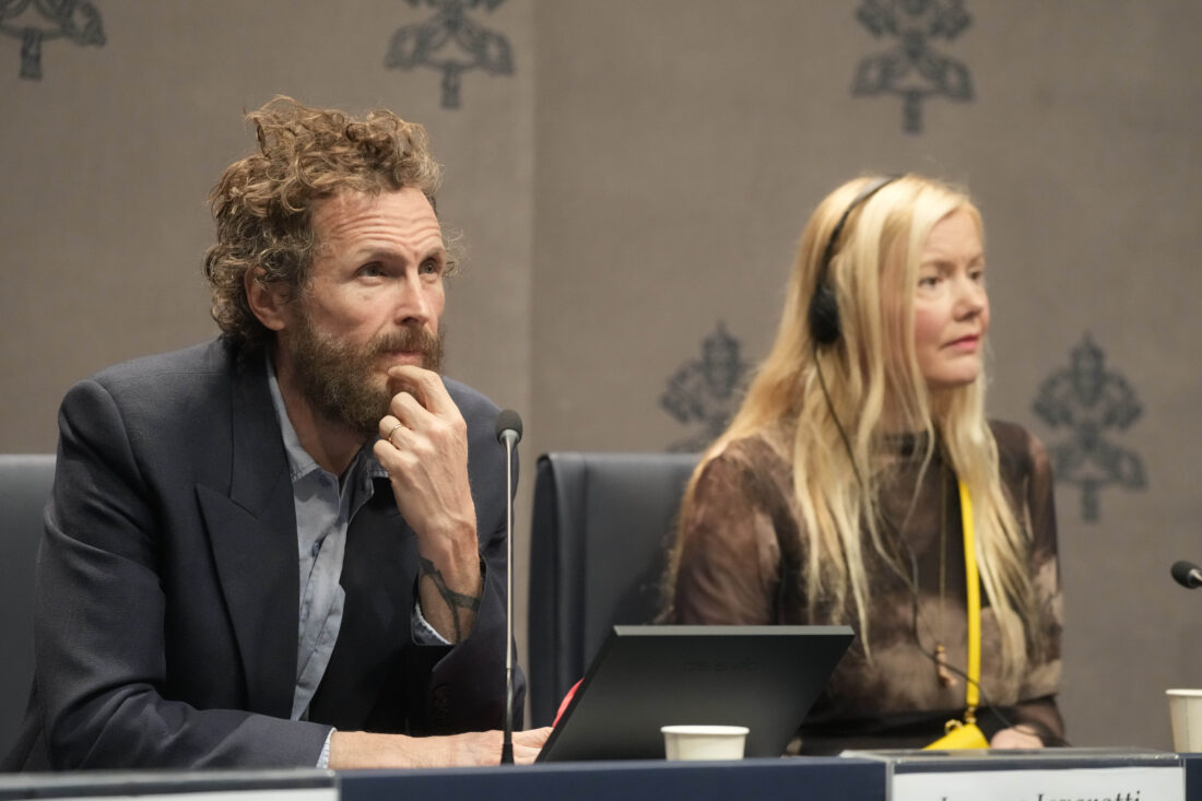 Italian artist Lorenzo Jovanotti Cherubini, left, and Icelandic artist Kristjana S. Williams attend a press conference presenting the exhibition “En Route” organized by the Vatican Apostolic Library exploring world tours of the late 19th century at the Vatican, Friday, Jan. 31, 2025. (AP Photo/Gregorio Borgia)