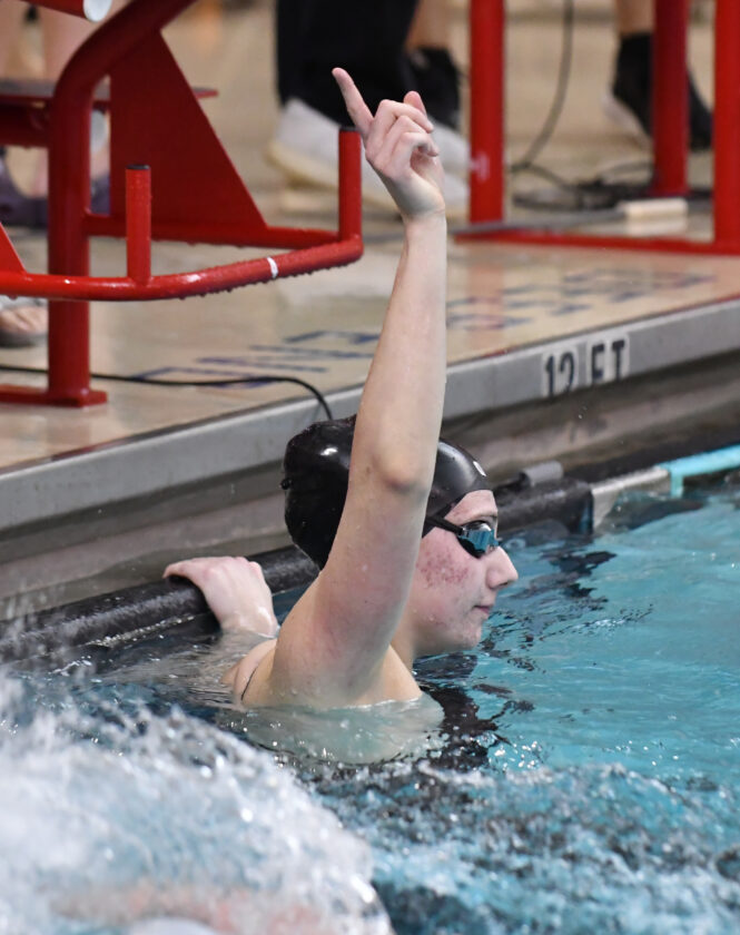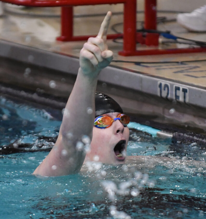 Lewisburg’s Colin Shannon celebates after finishing the Boys 200 Yard Freestyle in the District IV Class AA Swimming Championships at Williamsport High School Wednesday.